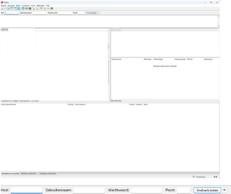 Open FileZilla. Je ziet dit scherm:
